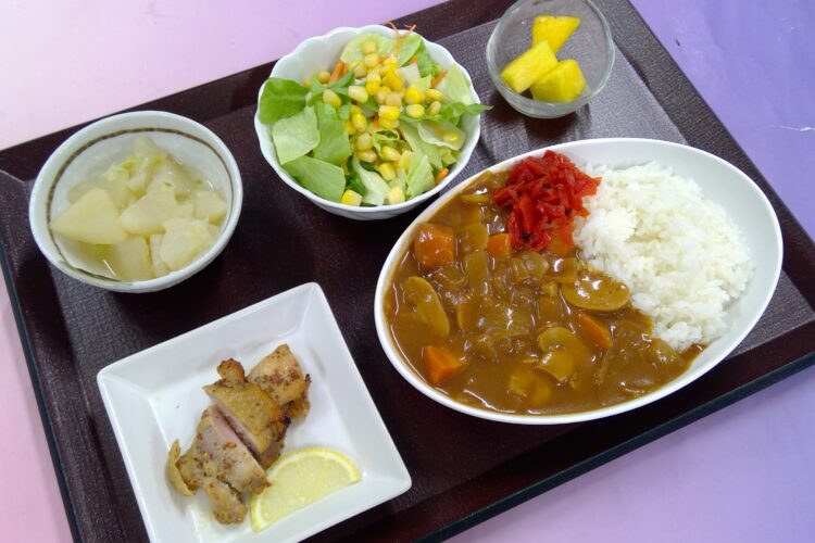 皆様こんばんは。 12月のお食事のご紹介です。 12月11日 朝食です。 ご飯・ベーコンエッグ・鶏のおかか煮・レタスコーンサラダ・さつま芋のはちみつ煮・味噌汁・果物(キウイフルーツ)・牛乳 でした。 12月11日 昼食で ...
