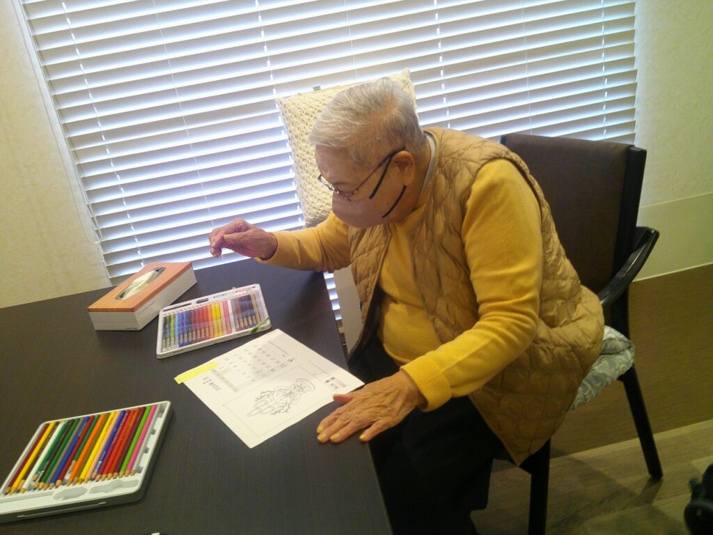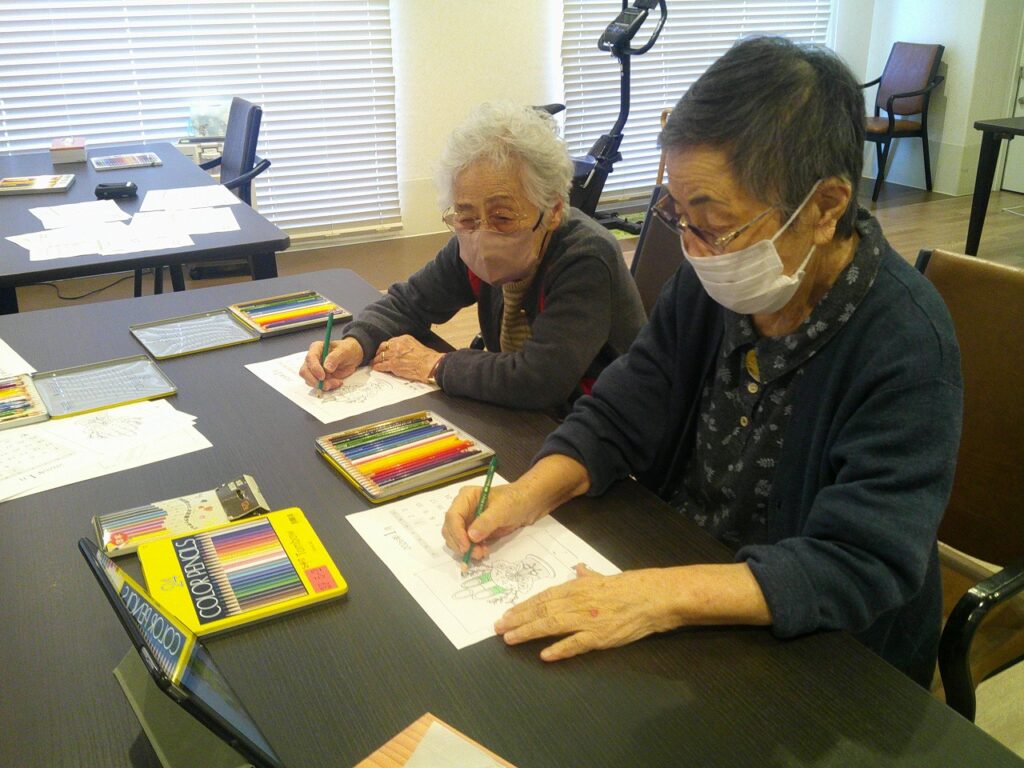門松やお正月飾り、絵馬や鶴など縁起物の塗り絵が多くありましたよ。