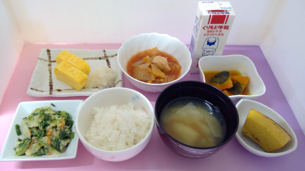 ご飯・鶏肉のトマト煮・だし巻きたまご・チンゲン菜の胡麻和え・かぼちゃのツナ煮・味噌汁・果物・(バナナ)・ 牛乳でした。