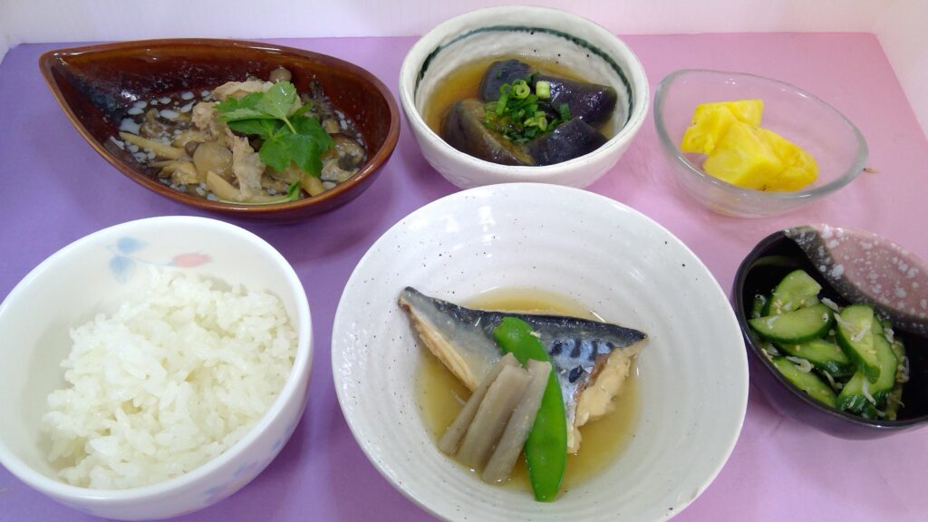ご飯・サバの味噌煮・豚肉とキノコのおろし煮・きゅうりしらす和え・なすの揚げ浸し・果物(パイナップル)でした。