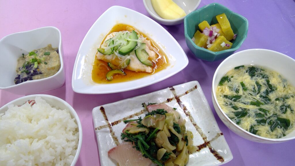 ご飯・よだれ鶏・ぶりザーサイ和え・黒酢サツマイモ・茄子の坦々・ニラ玉スープ・果物(りんご)でした。