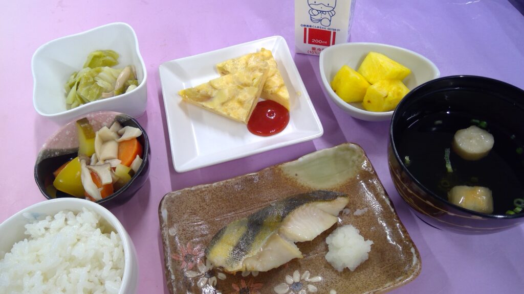 ご飯・焼魚(ほっけ)・プレーンオムレツ・キノコたっぷりピクルス・アンチョビキャベツ・とろろ昆布汁・果物(パイナップル)・牛乳でした。
