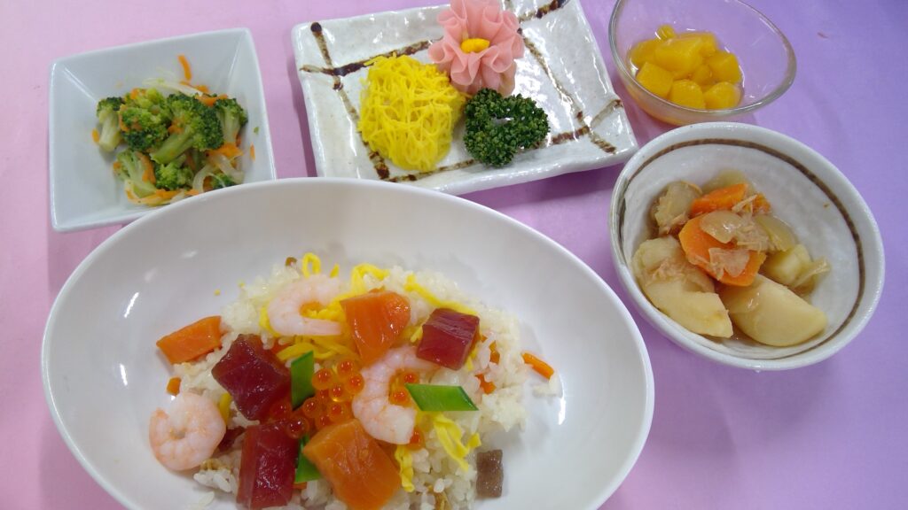 海鮮ちらし寿司・シュウマイ・ブロッコリーと人参の辛子和え・じゃがツナ煮・ 果物(黄桃缶)でした。