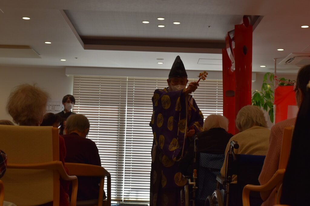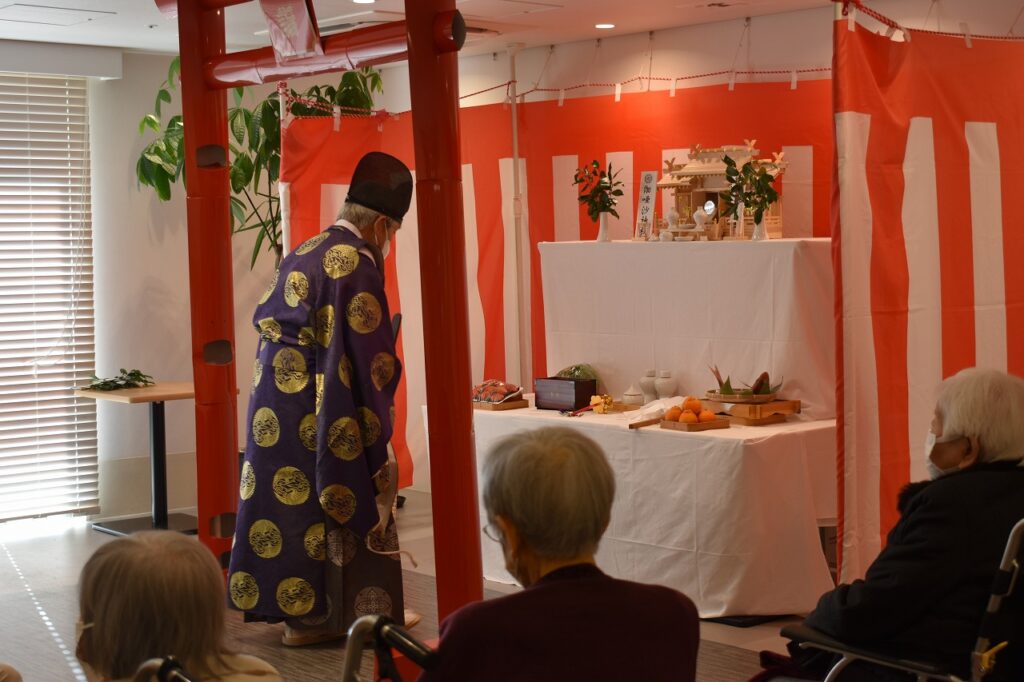 進雄神社の神主さんに来ていただき式を執り行っていただいたことで、ご入居者様と初詣を楽しむことができました。