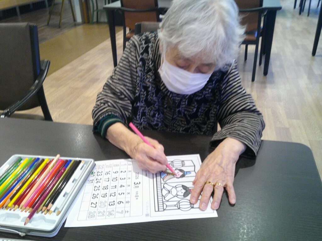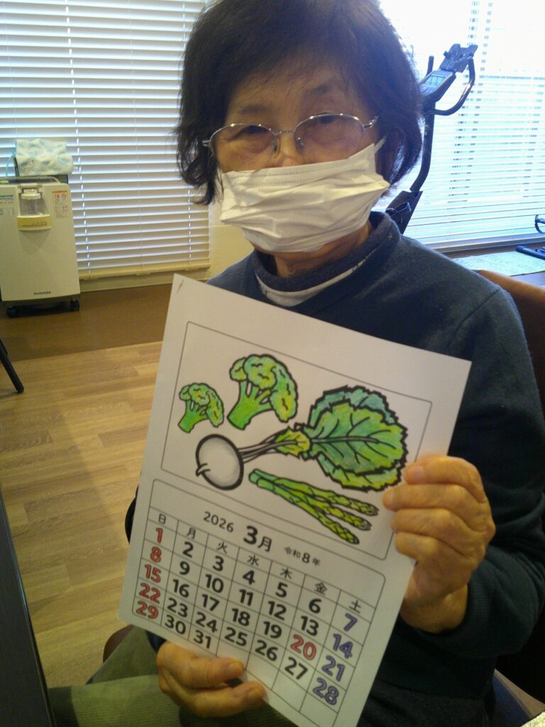 春のお野菜やお雛様の描かれた3月のカレンダーを素敵に色付けていただけました。