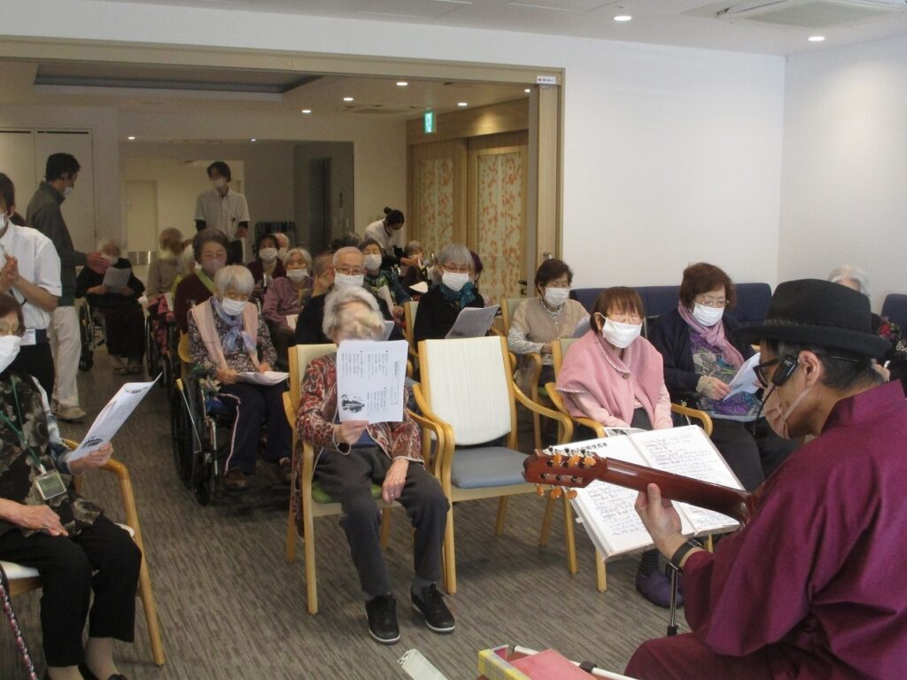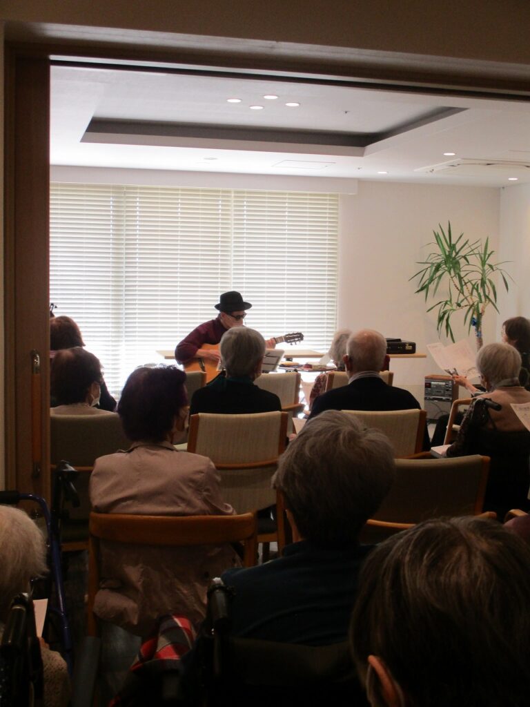 やわらかなギターの音色に合わせて、どこか懐かしい歌が流れると、ご入居者様からは自然と口ずさむ声が聞かれ、会場は穏やかで温かな空気に包まれました。手拍子をされる方や、目を閉じてじっくりと耳を傾けられる方など、それぞれの楽しみ方で音楽の時間を過ごされていました。