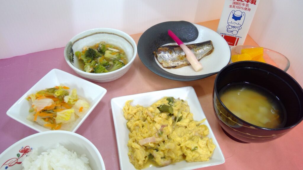 11月20日の朝食は、ご飯・いわしの生姜煮・スクランブルエッグ・白菜レモン和え・ブロッコリーと玉ねぎのスープ煮・味噌汁・果物(オレンジ)・牛乳です。
