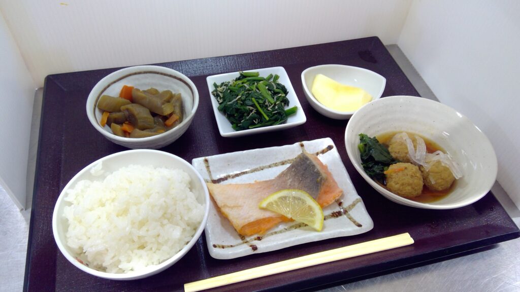 11月20日の夕食は、ご飯・サケのムニエル・肉団子和風スープ煮・ほうれん草のしらす和え・なすみそ煮・果物(りんご)です。