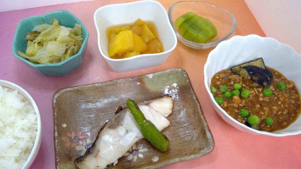ご飯・麻婆茄子・クロムツの粕漬け・キャベツのおかか和え・さつま芋のはちみつ煮・果物(キウイフルーツ)でした。