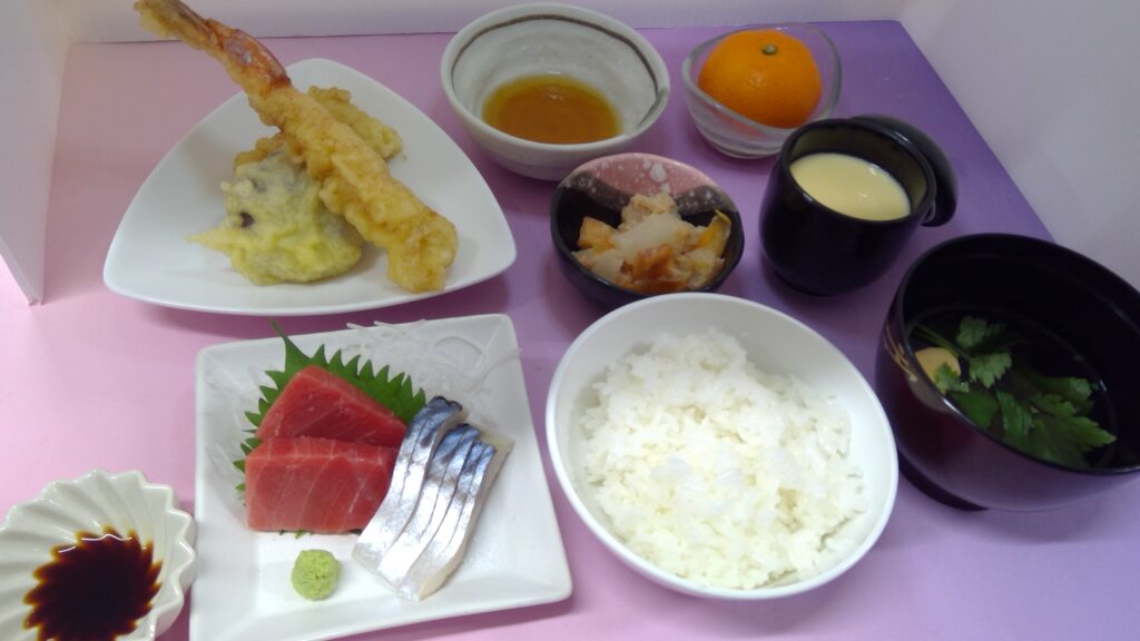 ご飯・刺身・天ぷら盛り合わせ・大根のツナ和え・茶碗蒸し・すまし汁 果物 でした。