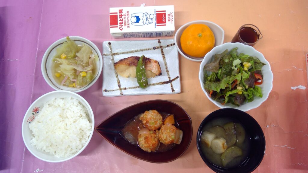 ご飯・赤魚の白醤油焼き・ソイフルボールのトマト煮込み・彩りサラダ・キャベツとコーンのサッと煮・味噌汁・果物(みかん)・牛乳でした。