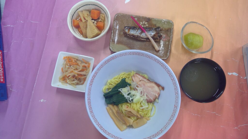 塩ラーメン・いわしの梅煮・もやしナムル・たけのこ煮・果物(キウイフルーツ)でした。