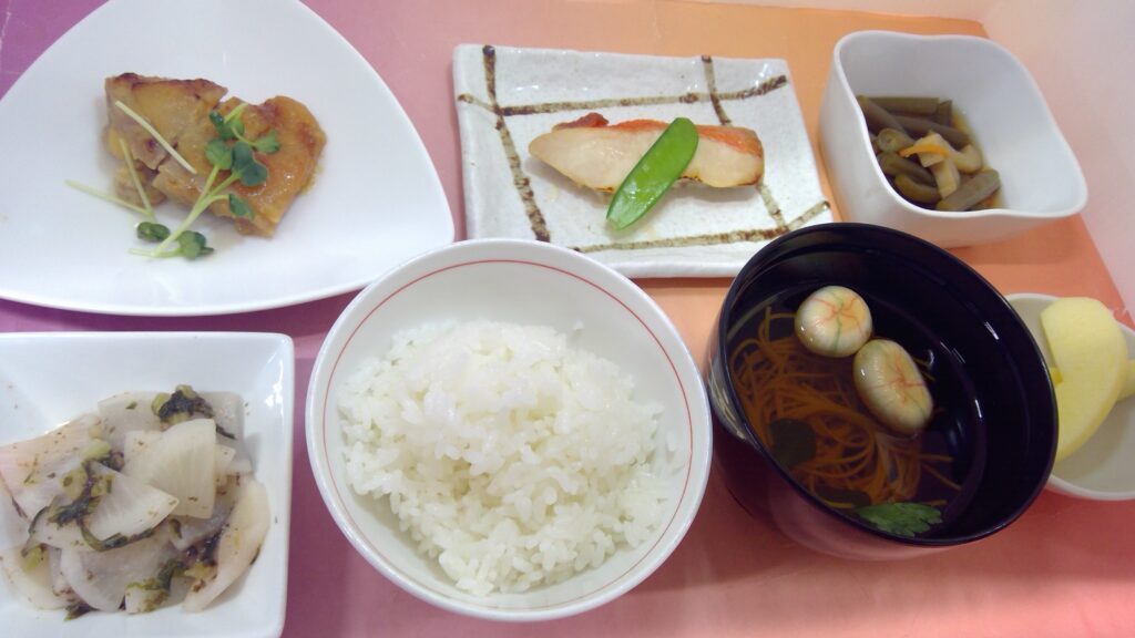 ご飯・金目鯛のゆず香り焼き・鶏肉の西京焼き・かぶの梅和え・いんげんと竹輪煮の物・すまし汁・果物(りんご) でした。