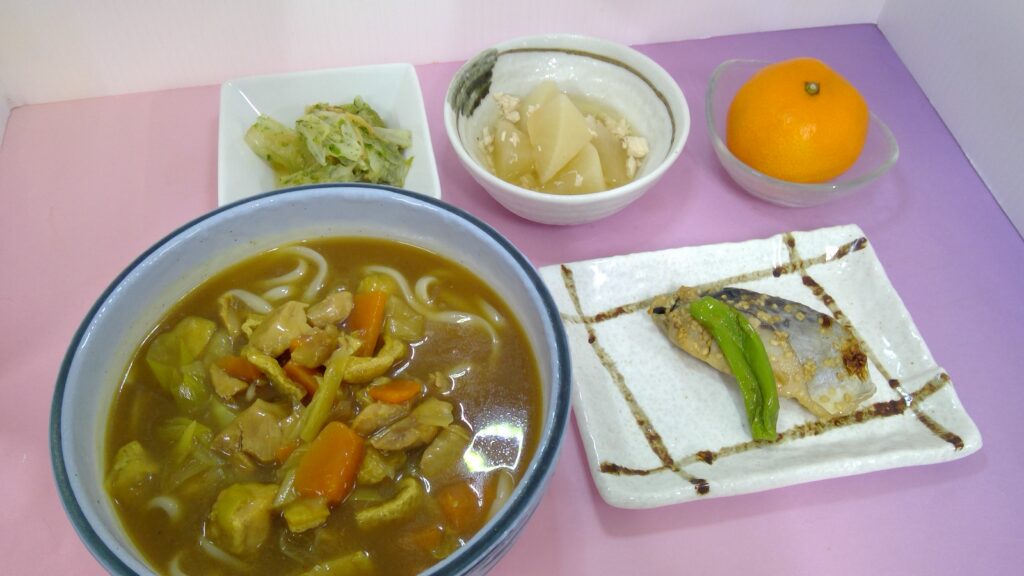 カレーうどん・サワラの胡麻味噌焼き・キャベツのなめたけ和え・大根と帆立の煮物・果物(みかん) でした。