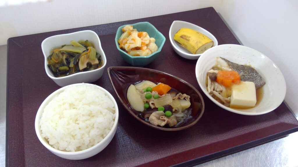ご飯・肉じゃが・魚のちり蒸し・カリフラワー和風ドレッシング和え・チンゲン菜と竹輪の煮物・果物(バナナ) でした。