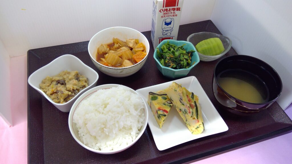 ご飯・中華風オムレツ・鶏肉のトマト煮・ほうれん草と人参のお浸し・卯の花炒り・味噌汁・果物(キウイフルーツ)・牛乳 でした。