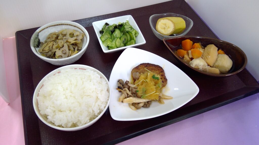 ご飯・和風ハンバーグ・里芋といかの煮物・胡瓜とわかめの酢の物・レンコンと高菜の炒め物・果物(バナナ)でした。