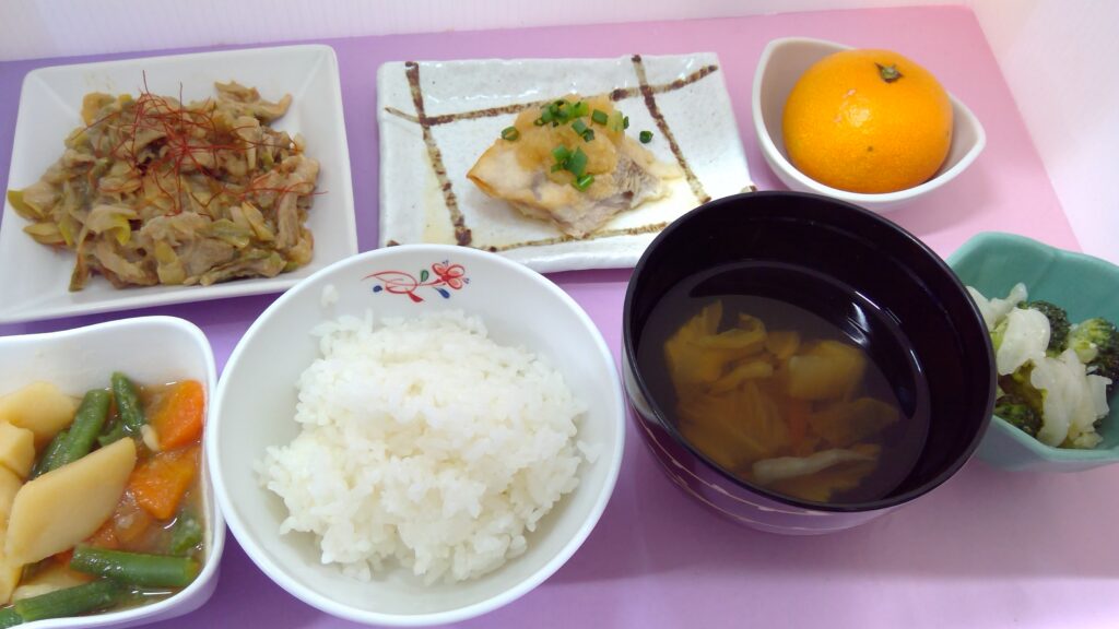 ご飯・豚肉とネギの塩炒め・カジキの和風ムニエル・キャベツとブロッコリーの茹で和え・じゃがいもの煮付け・すまし汁 果物(みかん) でした。