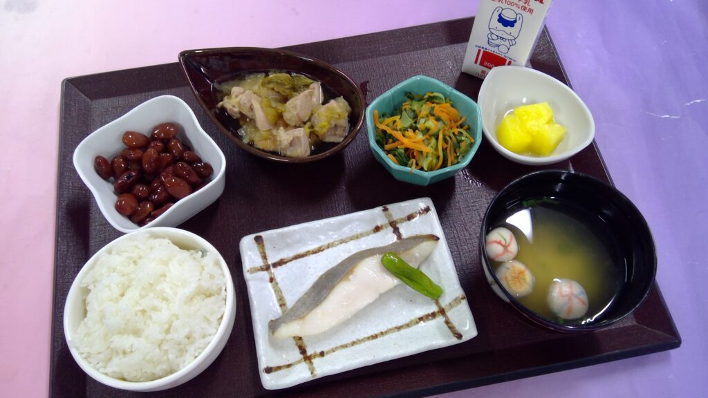 ご飯・沖目鯛の柚子麹漬け・鶏肉のすき焼き風煮・チンゲン菜のお浸し・煮豆・味噌汁・果物(パイナップル)・牛乳でした。