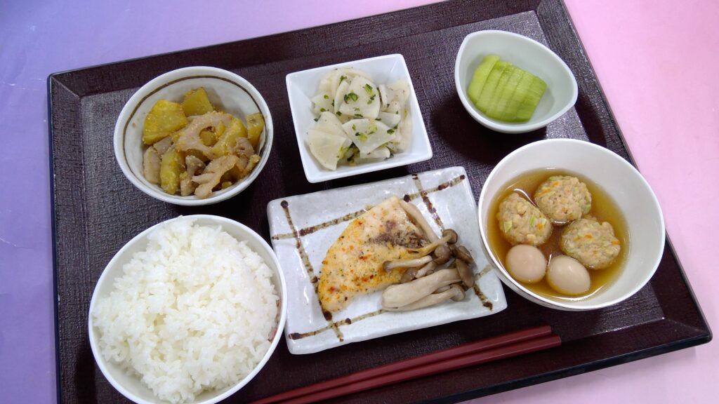 ご飯・ソイボールのさっぱり煮・カジキ香草パン粉焼き・かぶの梅和え・さつまいもと蓮根の醤油炒め・果物(キウイフルーツ)でした。