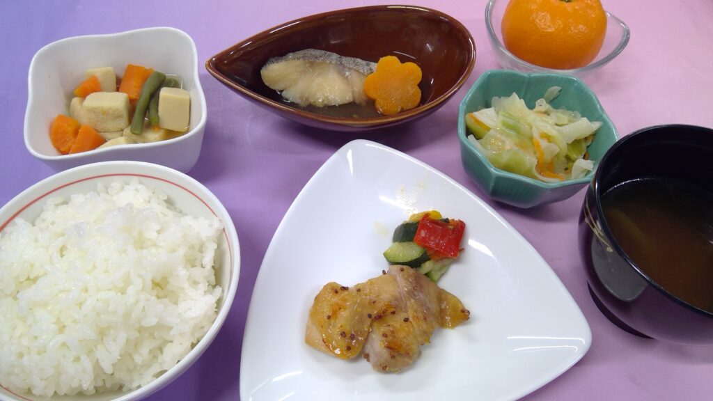 ご飯・タラの煮付け・鶏肉のハニーマスタード焼き・野菜サラダ・高野豆腐の煮付け・オニオンスープ・ 果物(みかん)でした。