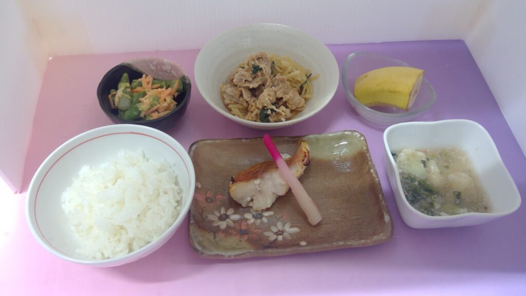 ご飯・赤魚の粕漬け・豚しゃぶ・アスパラマヨ和え・カリフラワー泡雪あん・果物(バナナ)でした。