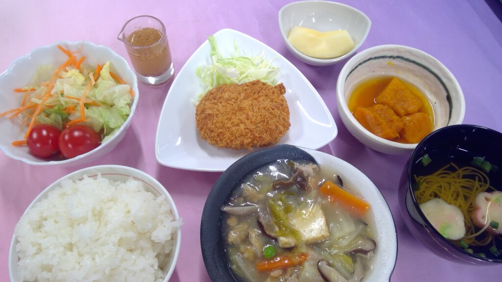 ご飯・八宝菜・野菜コロッケ・グリーンサラダ・かぼちゃの甘煮・すまし汁 ・果物(りんご)でした。