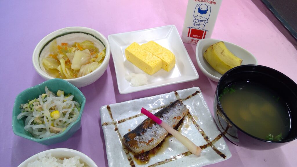 ご飯・だし巻きたまご・いわしの梅煮・春雨のピリ辛和え・キャベツの煮びたし・味噌汁・果物(バナナ)・牛乳でした。