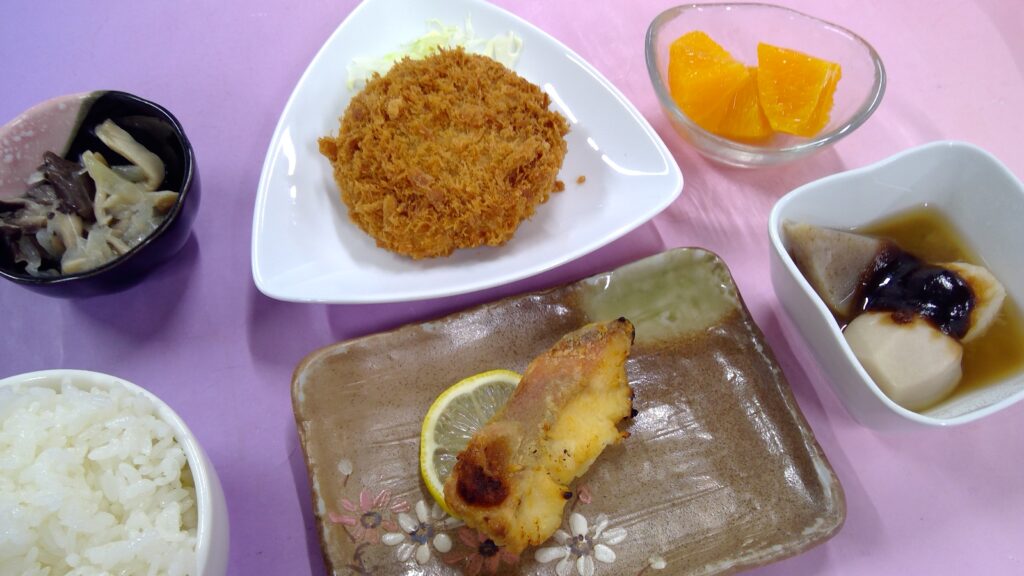 ご飯・メンチカツ・赤魚のレモンバター焼き・きのこのマリネ・里芋田楽・果物(オレンジ)でした。
