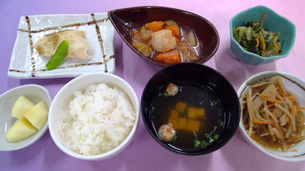 ご飯・カジキの柚子こしょう風味・鶏肉のトマト煮・チンゲン菜の生姜和え・根菜の味噌きんぴら・すまし汁・果物(りんご)でした。