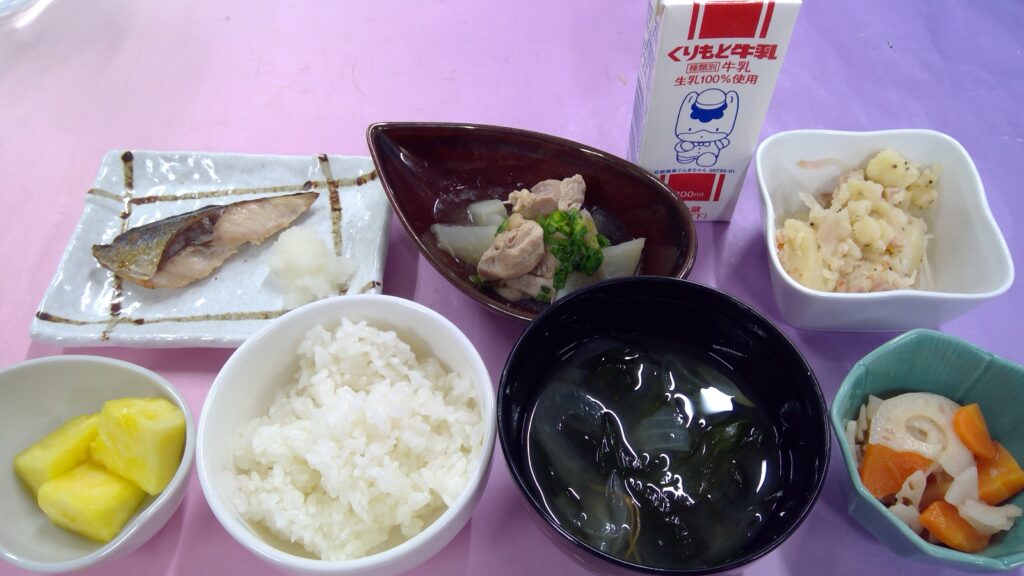 ご飯・とり大根・焼魚(アジ)・レンコンの甘酢漬け・じゃがいもとベーコン炒め・味噌汁・果物(パイナップル)・牛乳でした。