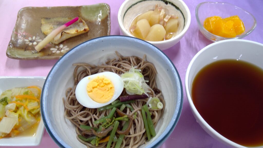 山菜そば・タラの西京焼き・白菜の金山寺味噌和え・カブのコンソメ煮・果物(オレンジ)でした。