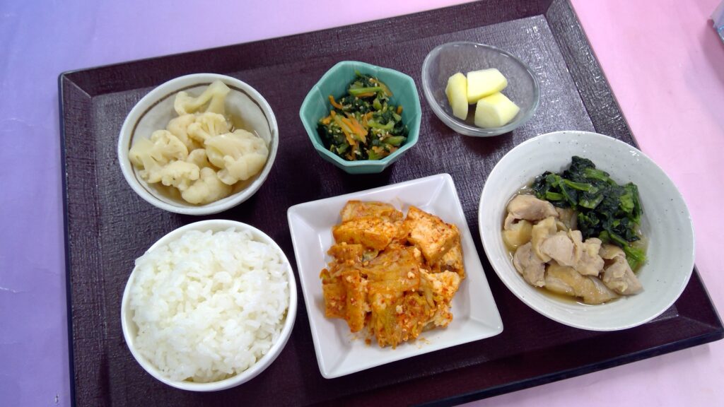 ご飯・鶏肉と玉葱のだしうま煮・厚揚げとキムチ炒め・小松菜のナムル・カリフラワーの煮びたし・果物(りんご)でした。
