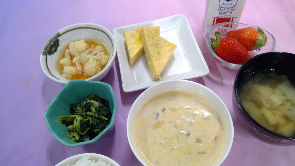 ご飯・ミートオムレツ・クラムチャウダー・青梗菜のピーナッツ和え・カリフラワー軟らか煮・味噌汁・果物(いちご) ・牛乳でした。