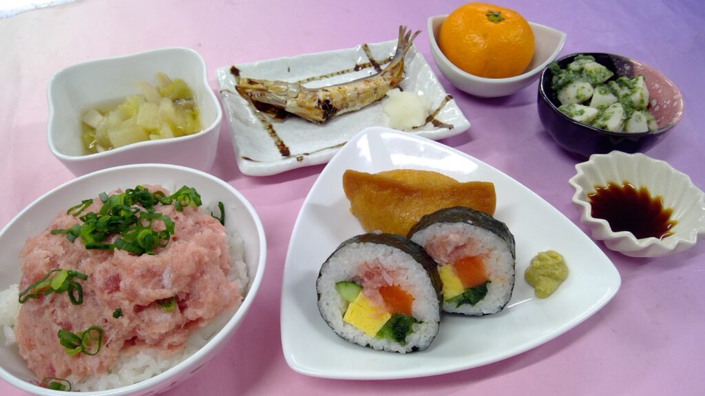 稲荷・巻き寿司・いわしの丸干し・里芋のとも和え・白菜とエリンギのだし煮・果物(みかん)でした。