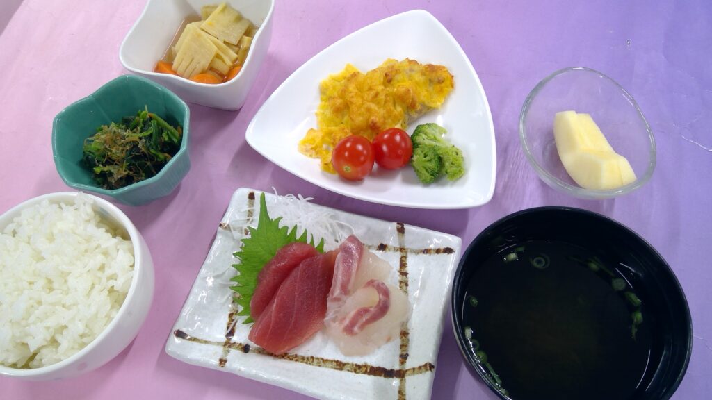 ご飯・お刺身・チキンピカタ・ほうれん草と人参のお浸し・筍の甘煮・とろろ昆布汁・果物(りんご)でした。