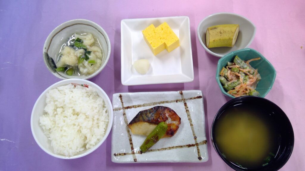 ご飯・厚焼きたまご・サバのみそ粕漬け・アスパラマヨ和え・カリフラワー泡雪あん・味噌汁・果物(バナナ)・ 牛乳でした。