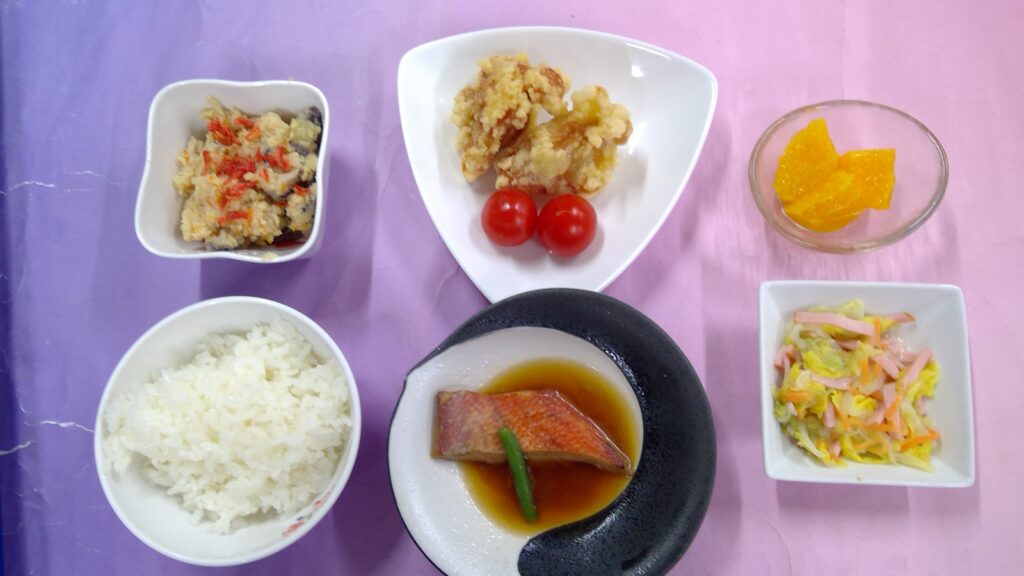 ご飯・鶏の唐揚げ・金目鯛の煮付け・白菜とハムのフレンチサラダ・卯の花炒り・果物(オレンジ)でした。