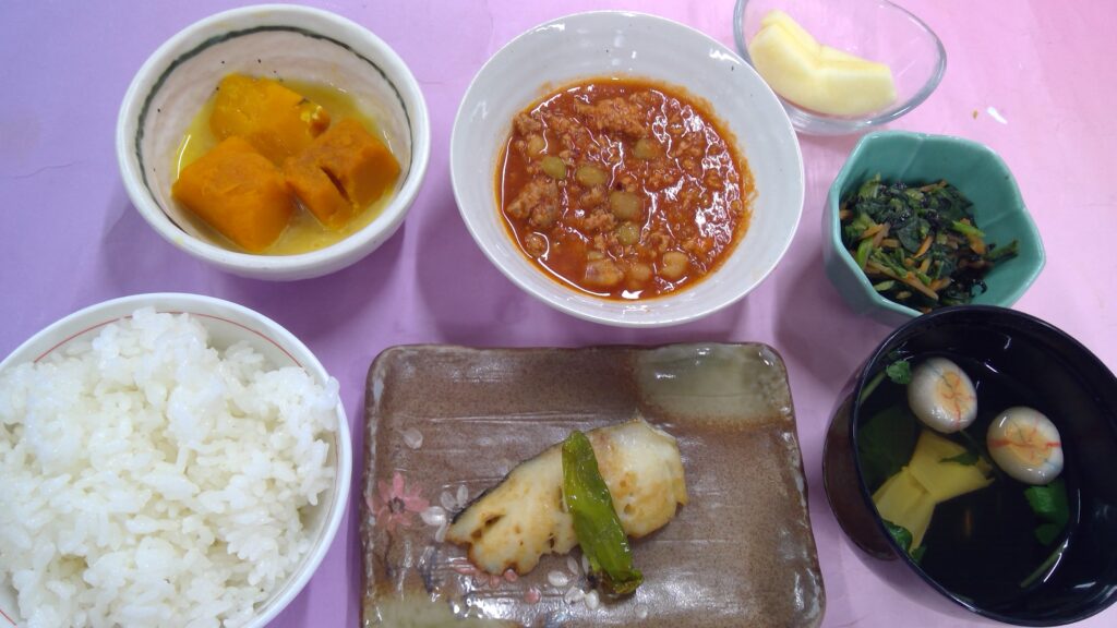 ご飯・チリコンカン・タラのバター醤油焼き・ほうれん草の磯辺和え・かぼちゃミルク煮・すまし汁・果物(りんご)でした。
