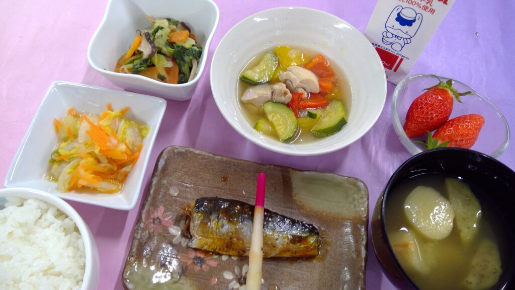 ご飯・鶏肉のやわらか煮・いわしの生姜煮・白菜レモン和え・チンゲン菜のソテー・味噌汁・果物(いちご)・牛乳でした。