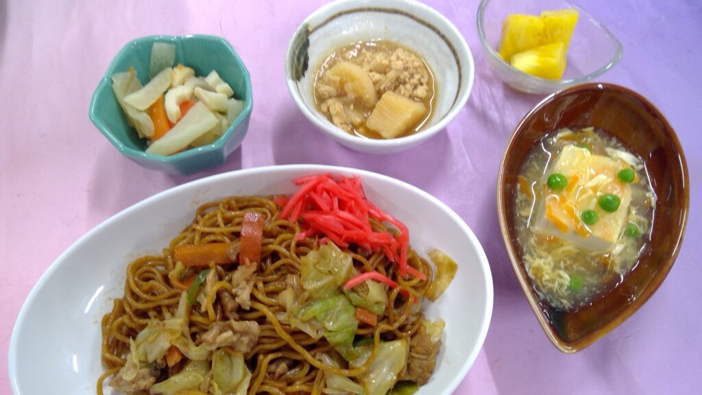 焼きそば・豆腐の卵あんかけ・大根のわさび和え・長いもの鶏みそ煮・果物(パイナップル)でした。