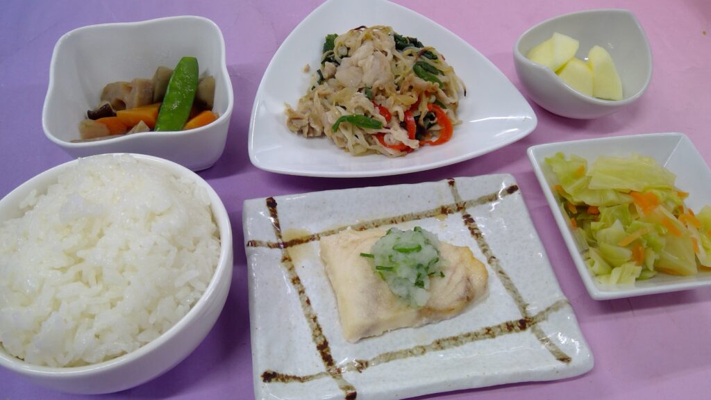 ご飯・カジキの和風ムニエル・豚肉と玉葱ニラ炒め・キャベツの浅漬け・根菜の煮物・果物(りんご)でした。