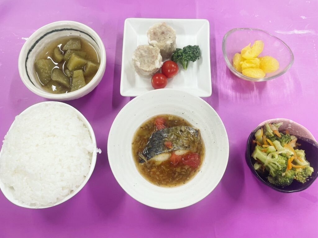 ご飯・サワラの四川風あん・肉シュウマイ・ブロッコリーと人参の辛子和え・蒸し茄子のおろし煮・果物(夏みかん缶)でした。