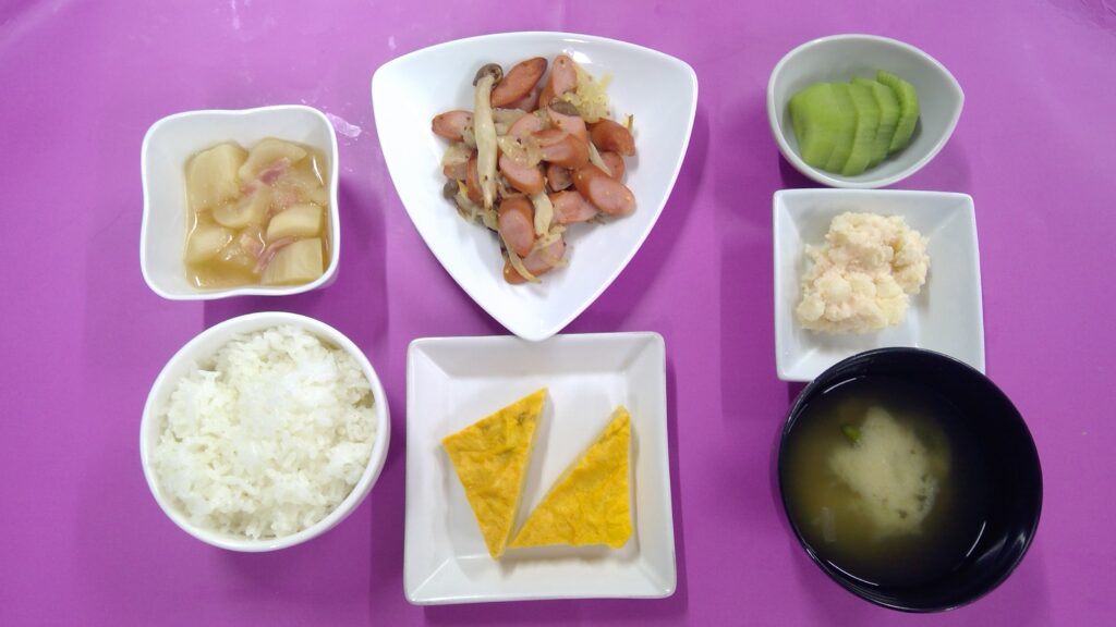 ご飯・プレーンオムレツ・ウインナーしめじ炒め・じゃが芋のたらこ和え・カブのコンソメ煮・味噌汁・果物(キウイフルーツ)・牛乳でした。