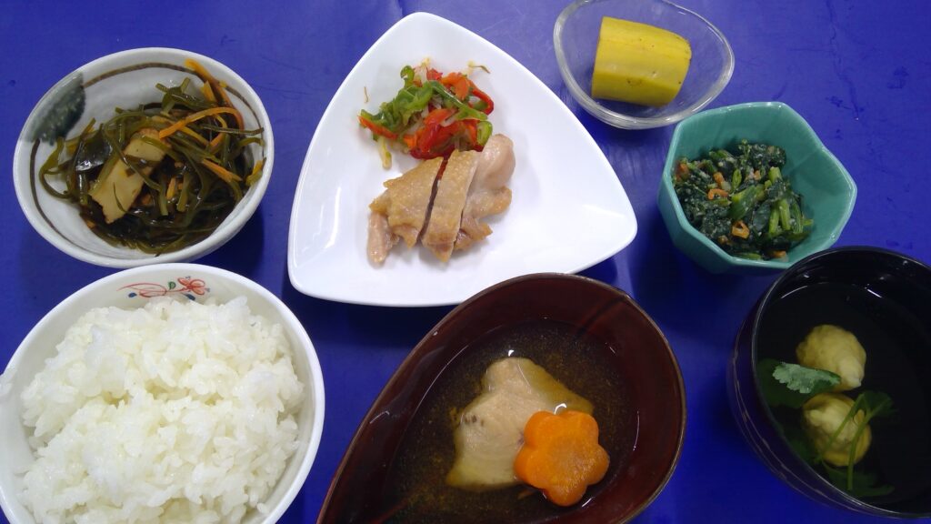 ご飯・鶏の照り焼き・カジキ煮魚・ほうれん草のごま和え・切り昆布の煮物・すまし汁・果物(バナナ)でした。