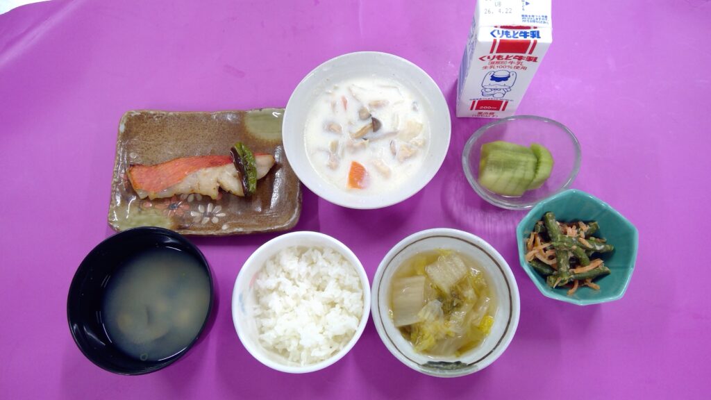 ご飯・金目鯛の味噌焼き・鶏肉のシチュー・いんげんのおかかマヨ和え・白菜洋風煮・味噌汁・果物(キウイフルーツ)・牛乳でした。