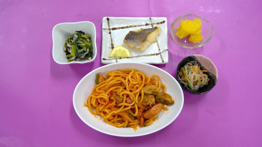 ナポリタンスパゲッティ/ご飯・もやしの梅肉和え・白身魚のレモンペッパー焼き・小松菜のペペロンチーノ・果物(夏みかん缶)でした。