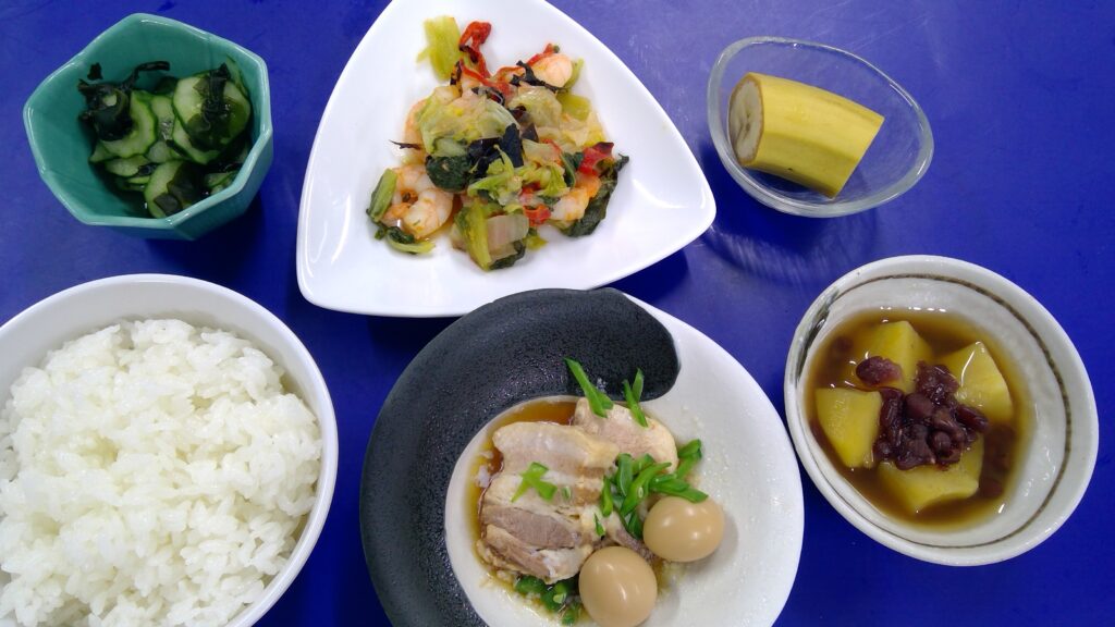 ご飯・豚の角煮・エビの中華炒め・胡瓜とわかめの酢の物・さつま芋と小豆の煮物・果物(バナナ)でした。